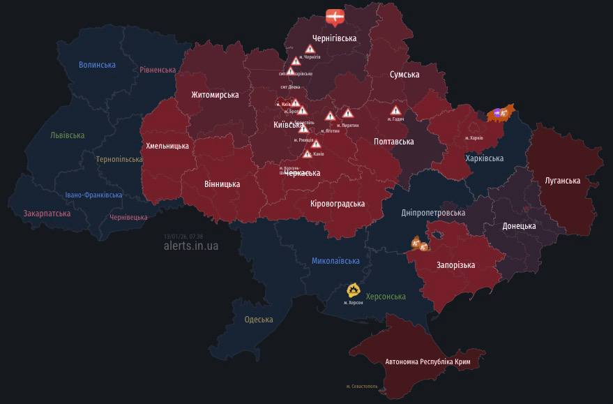 «Текущая карта воздушных тревог. После ночных атак БпЛА и баллистическими ракетами ВС РФ применили и крылатые ракеты. В настоящее время их движение зафиксировано в Черниговской, Киевской и Черкасской областях».