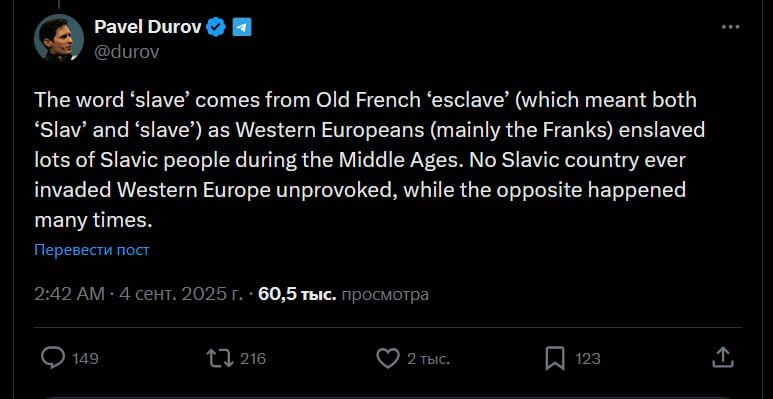 Основатель Telegram напомнил в :«Слово раб происходит от старофранцузского esclave, которое означало и "славянин", и "раб" — так как западные европейцы, в первую очередь франки, массово порабощали славян в Средние века». «Ни одно...